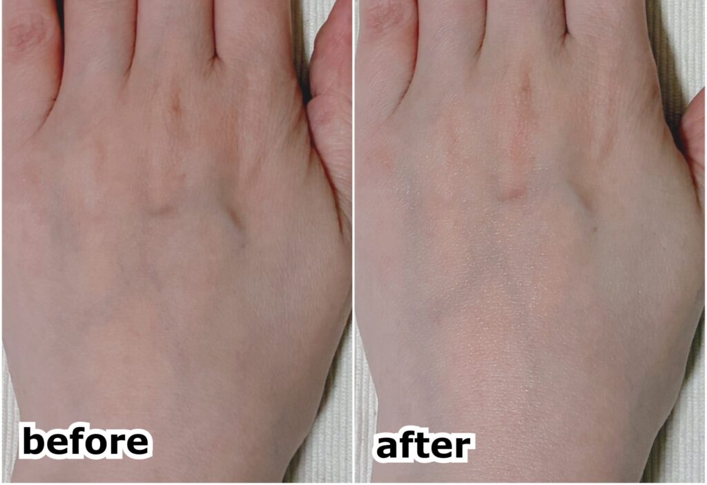 THE RETINOTIME WHITE (ザ・レチノタイム ホワイト) ホワイトニングモイストクリームを塗る前と塗った後の比較をしてみました。左のbeforeが手を洗った後に何も塗っていない状態。右のafterはホワイトニングモイストクリームを塗った後です。afterの手の甲は、しっかり水分補給と保湿がされたことで肌のくすみが抜けて生き生きとした明るい印象ですね。afterの方が若い人の手のように見えます。