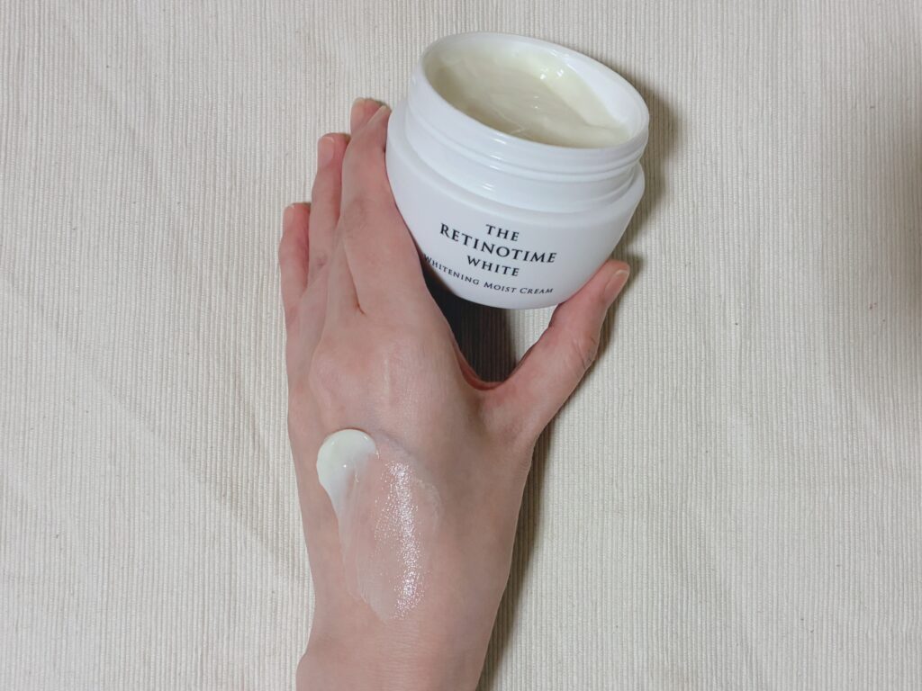THE RETINOTIME WHITE (ザ・レチノタイム ホワイト) ホワイトニングモイストクリームは、”クリーム”という商品名ですがジェルに近いみずみずしさと肌に塗り広げやすい柔らかなテクスチャーです。白いクリームは肌に適量を塗り広げると透明になるので白浮きはしません。洗顔後、水気を拭き取った肌に優しく塗り広げるだけでスキンケア終了です!塗り広げてから数分経つと肌にピタッと密着するような感覚があります。