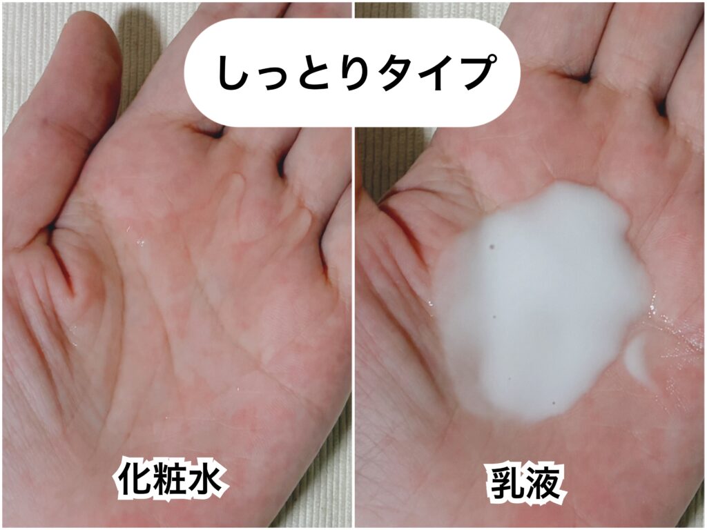 「しっとりタイプ」はしっとり感がかなり高い印象です。化粧水はとろみがあり、乳液はクリームに近いテクスチャーです。超乾燥肌さんは秋でも合いそうですね。筆者の肌にはしっとり感が強すぎる感じがしましたが、真冬の乾燥が激しい時期には合いそうです。こちらも肌になじんだ後は若々しく見えるツヤ感を与えてくれます。