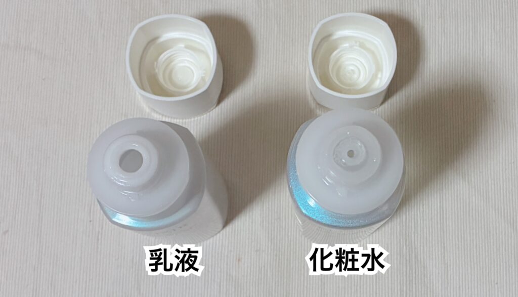 この画像はELIXIR(エリクシール) リフトモイスト ローション/エマルジョンの蓋を外した状態で真上から撮影しました。化粧水は中身が出てくる穴が小さいので、手のひらに取り出すとき特に気をつけることはありません。しかし、乳液は穴が大きいので要注意!手のひらに取り出すときドバッと大量に出てくることがあります。化粧水と同じ感覚でボトルを傾けると大惨事に。ボトルをゆっくり傾けながら少しずつ出してくださいね。