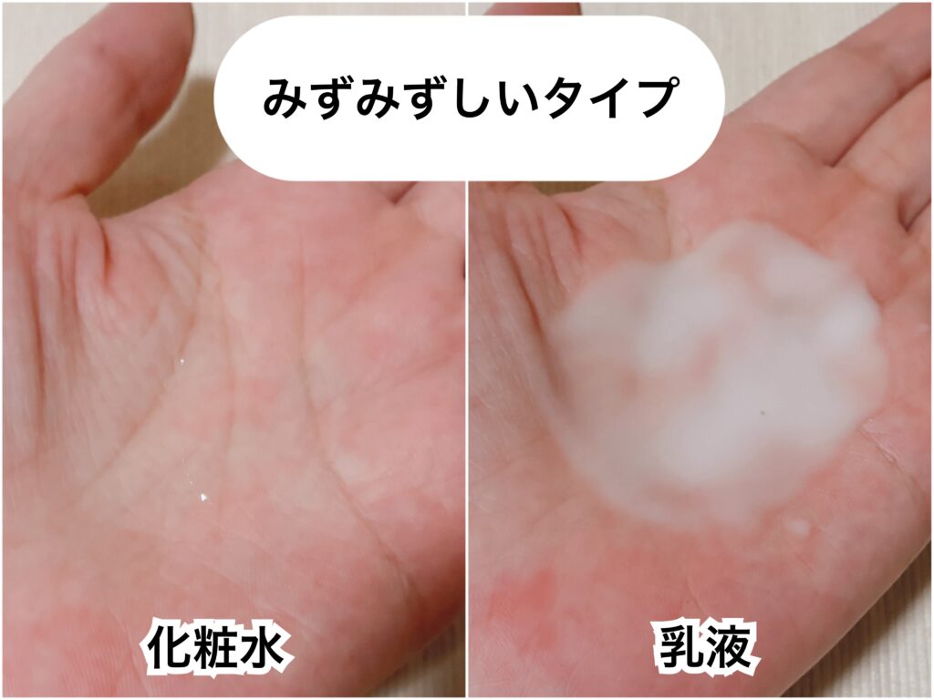 「みずみずしいタイプ」は一般的なさっぱりタイプの化粧水&乳液よりもうるおい効果が高いと感じました。化粧水と乳液のテクスチャーはサラッとしていますが浸透力が高いのでムチッと肌がうるおってハリ感がアップしたような感覚。肌が生き生きと見えるようなツヤ感を与えてくれます。