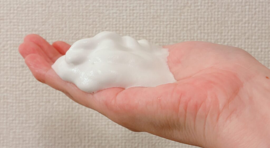 ② ぬるま湯で顔を濡らしてから手のひらに泡洗顔を出します(目安:4〜6プッシュ程度)