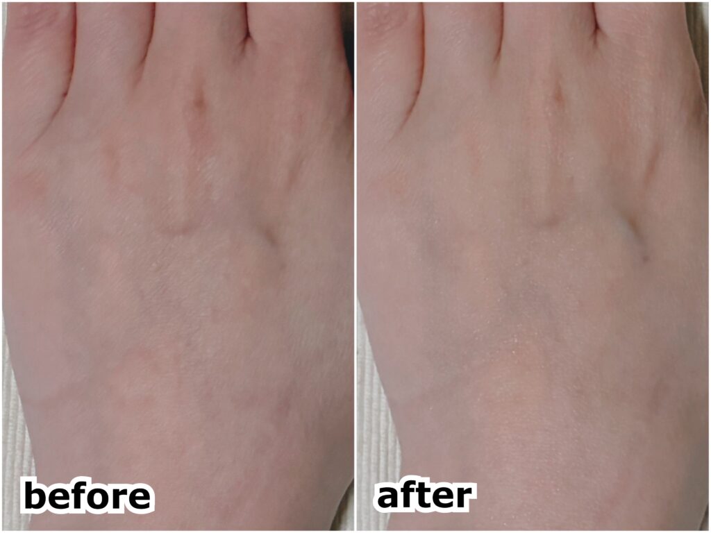 左の画像(before)は手を洗った後に何も付けていない状態です。右の画像(after)はリップス フェイススタイリングトナー(化粧水)を付けて30秒ほど経った後。左右の画像を見比べてみると、左よりも右の方が肌がうるおっているのでくすみが抜けて明るくキレイですね。肌表面にベタつきやヌルつきがないのも一目瞭然です。